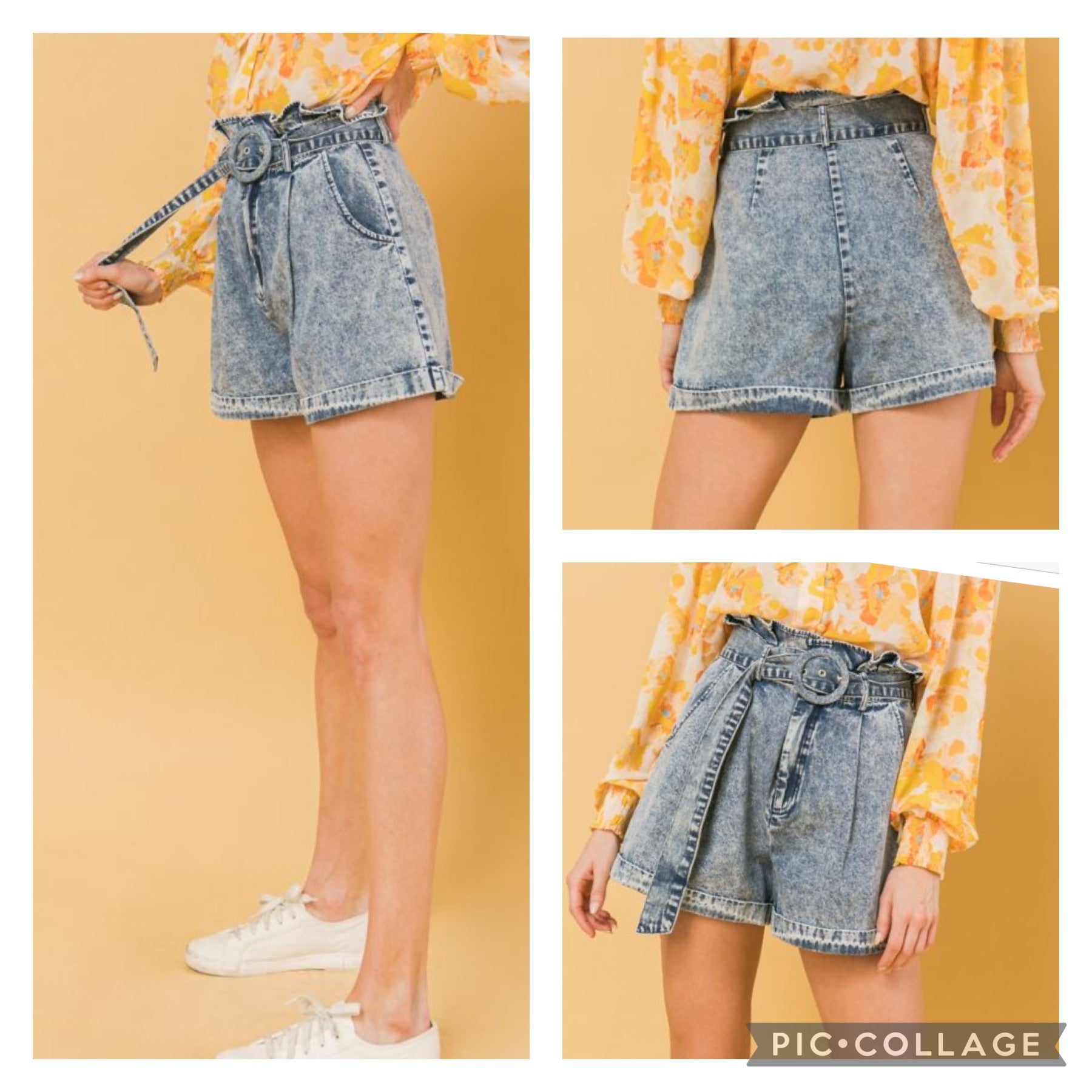 An acid wash denim short featuring paper bag waist with belt, side pockets and cuffed bottom