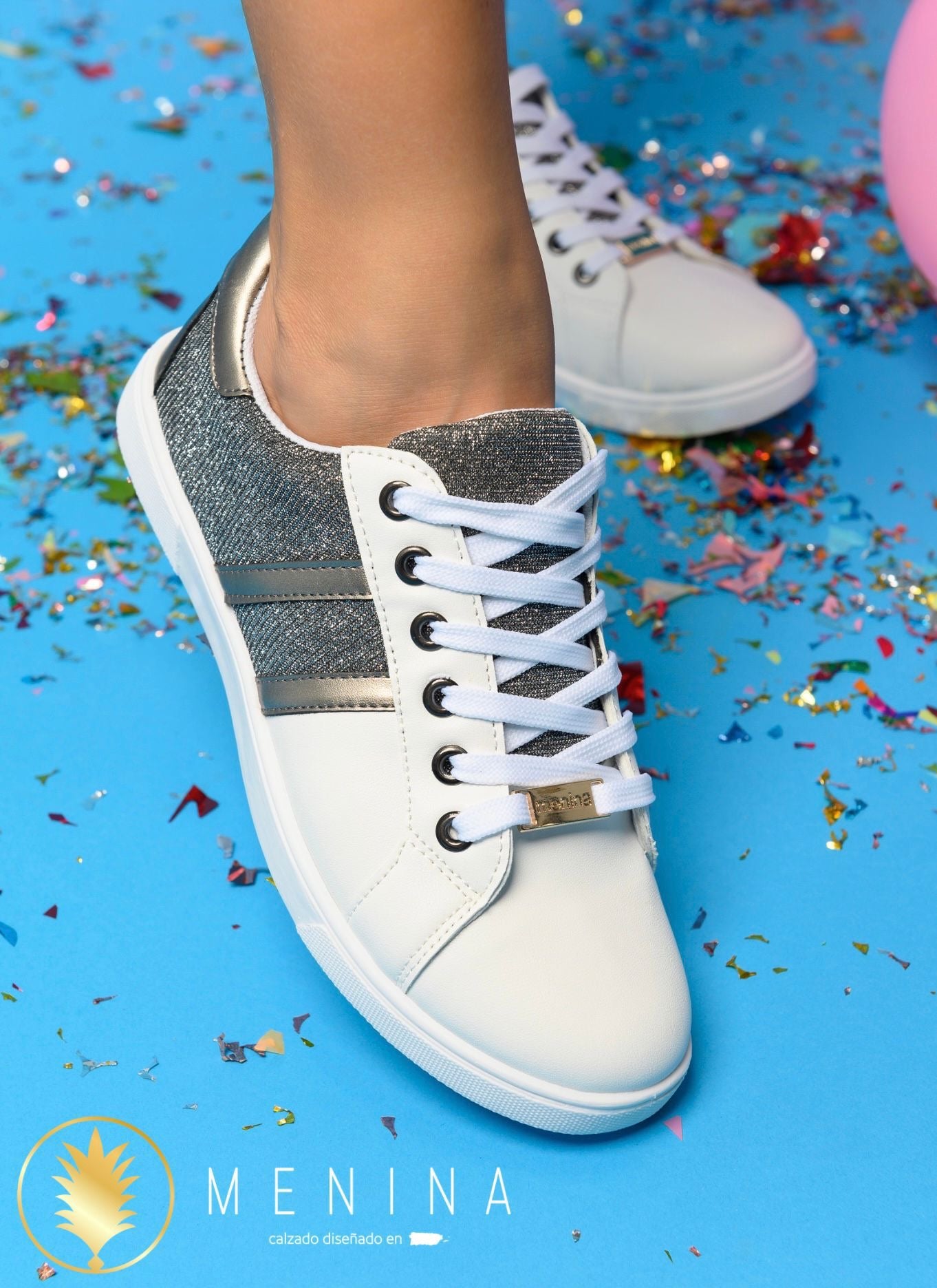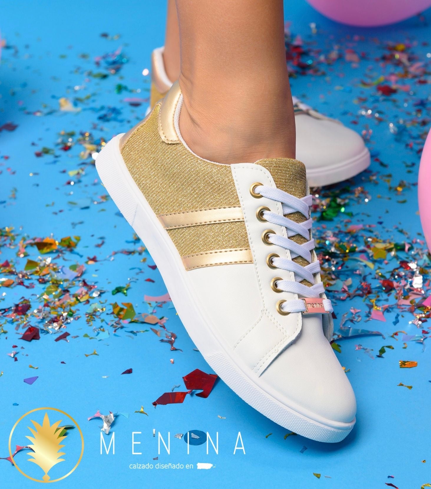 Jolly Menina sneakers are expertly designed in Puerto Rico, featuring a stylish gold or pewter detailing at the back. These low-cut sneakers add a touch of sophistication to any outfit, perfect for those looking for a blend of comfort and style.
