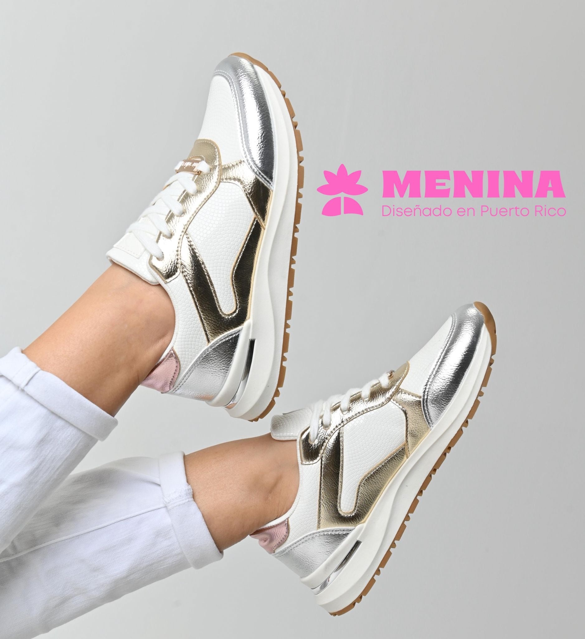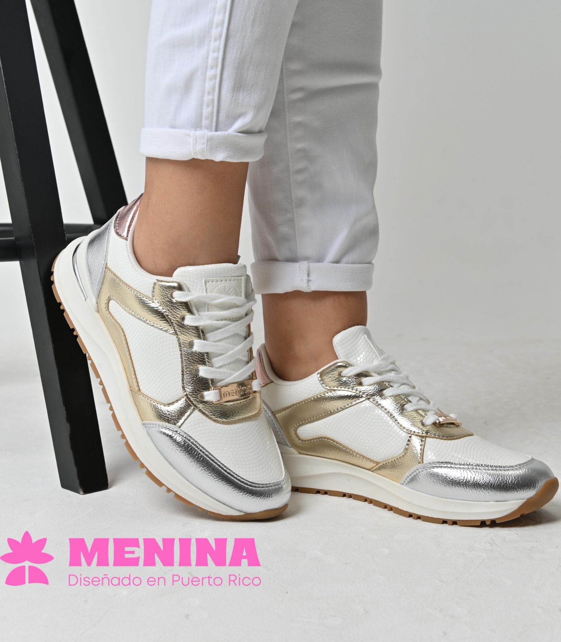 Pily sneakers for menina come in a sleek white design with metallic accents in gold, silver, and rose. Perfect for adding a touch of shine to any outfit. These sneakers combine style and comfort for a seamless fashion statement.