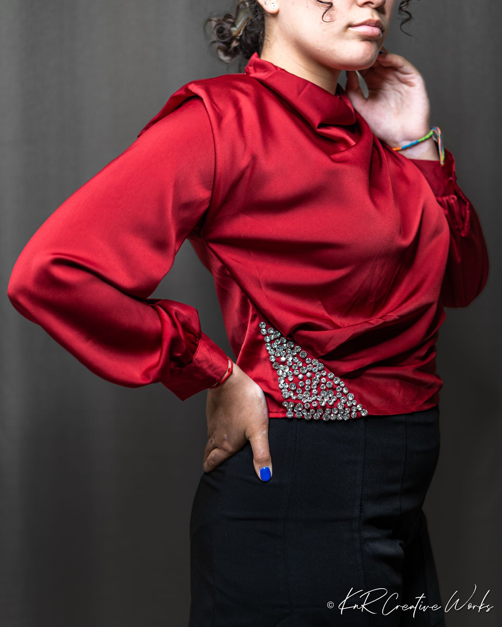 Long puff sleeves with twisted and gold sequins details. Material: 100% polyester