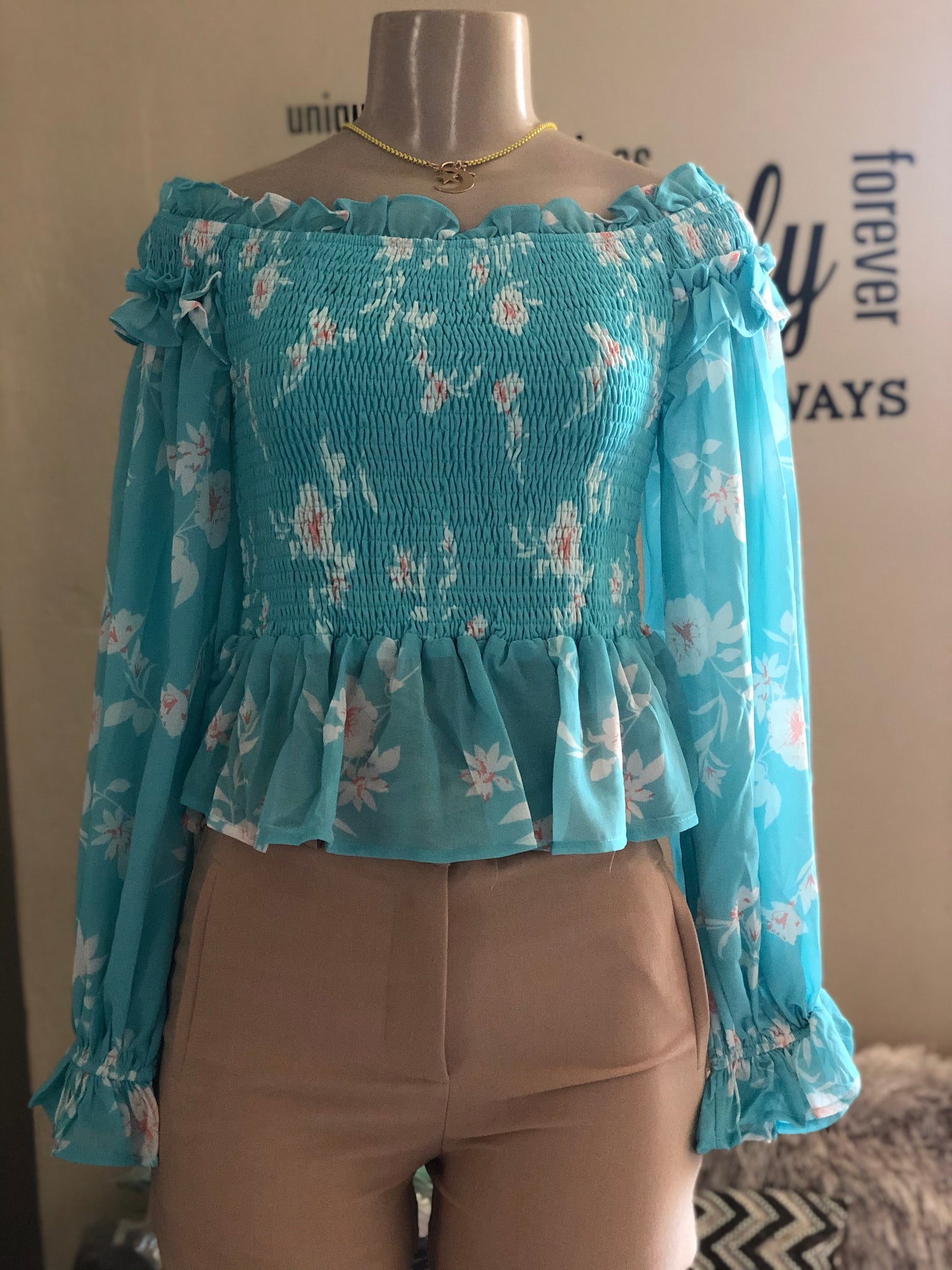 A printed woven off shoulder top featuring ruffled neck opening, peasant sleeve and smocked bodice with peplum