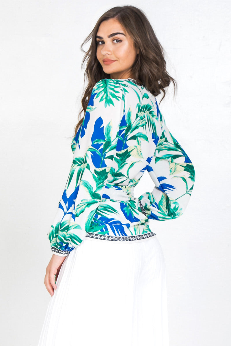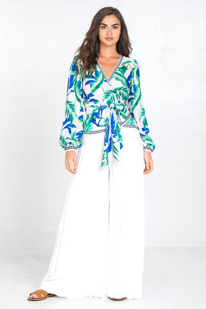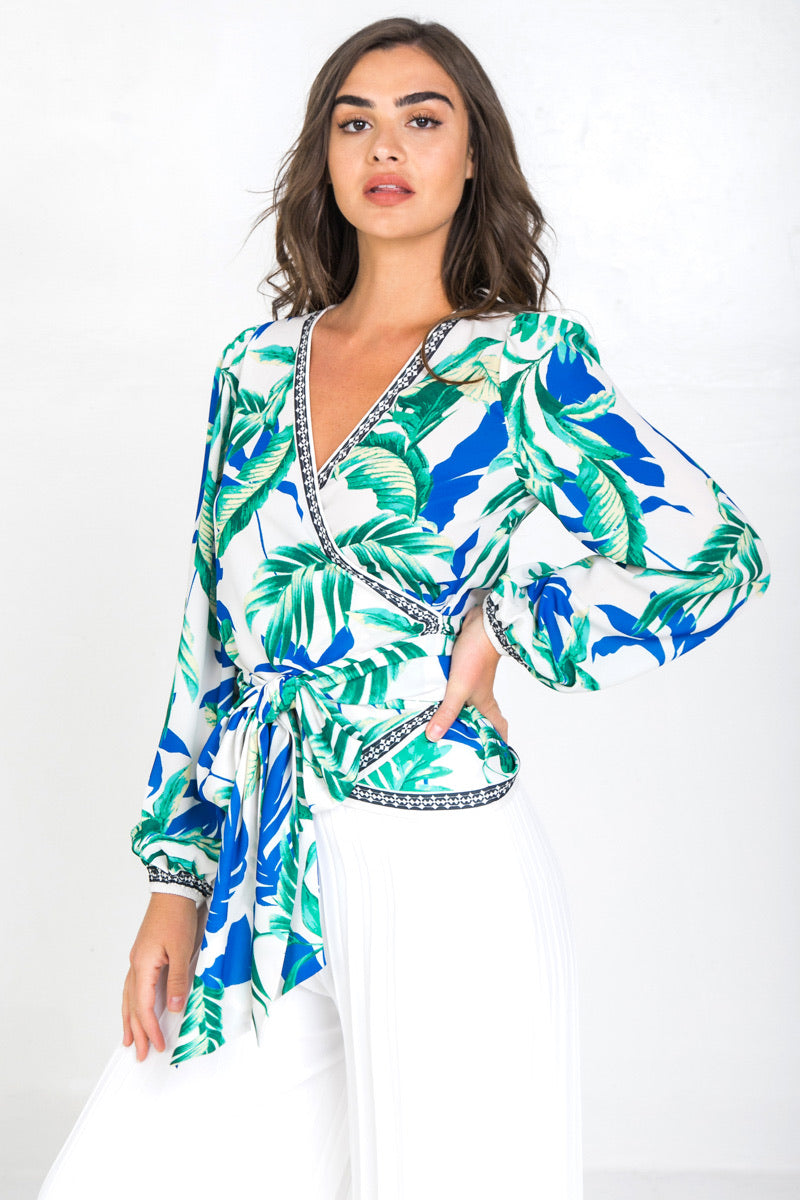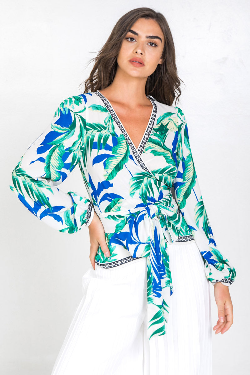 A printed wrap shirt featuring surplice neckline and long sleevesDetailsSelf: 100% PolyesterSize & Fit- Model is 5`9" And Wearing Size Small- Measurements Taken From Size Small- Approx. Length : 24.5