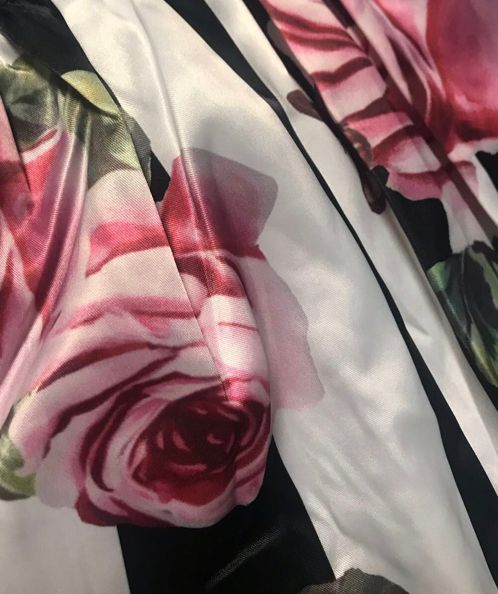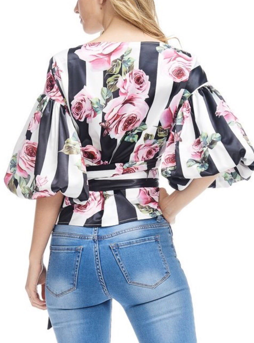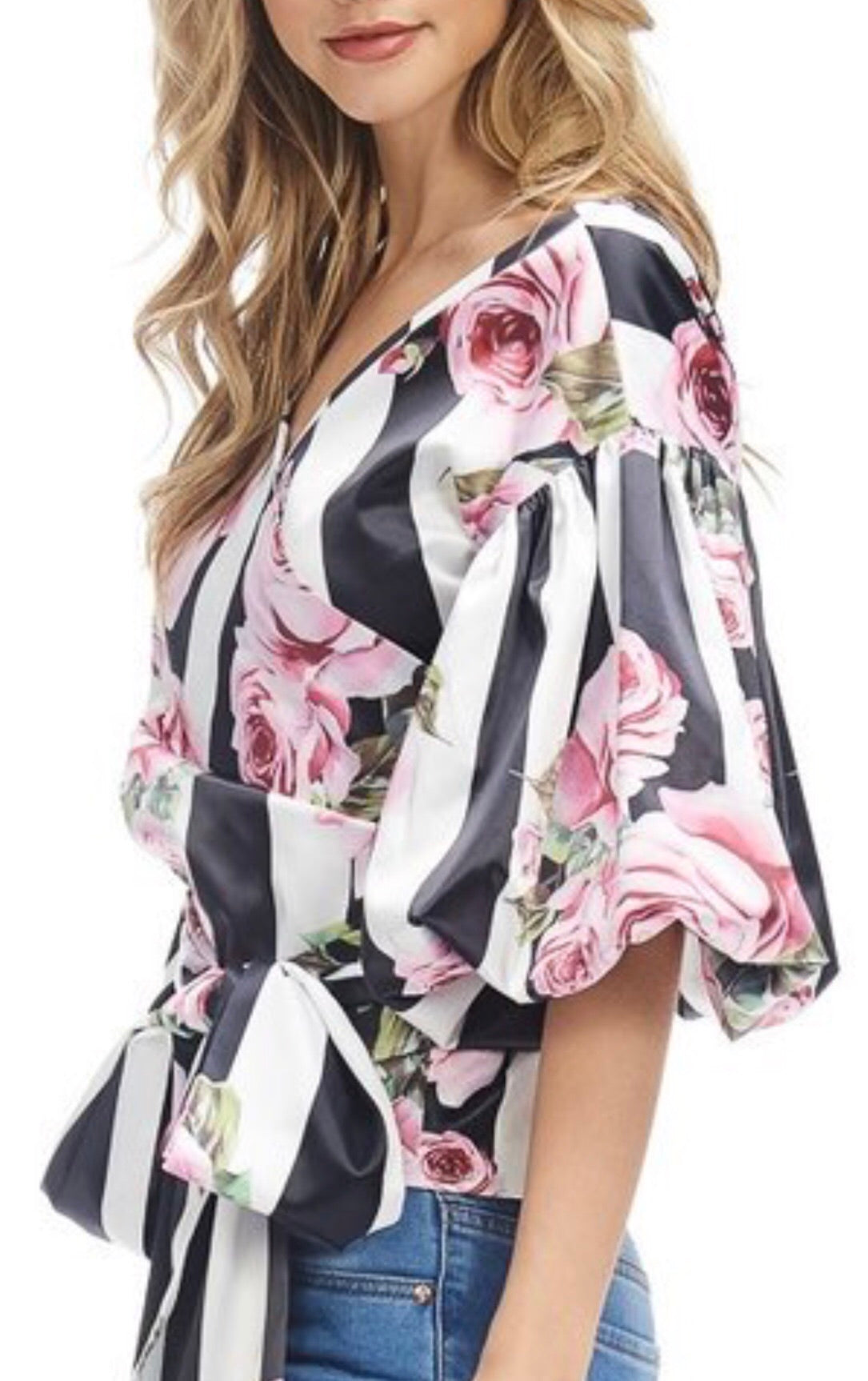 A dressy top with colorful floral prints on the fabric, stripes (black) all throughout, and a wrap style silhouette with a bow tie. Includes puffy 3/4 length sleeves.100% polyester, true size