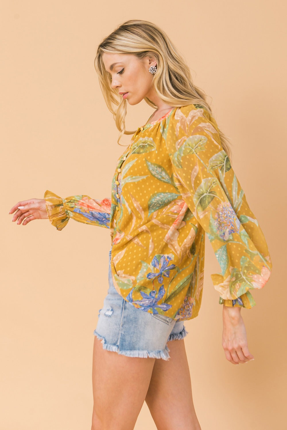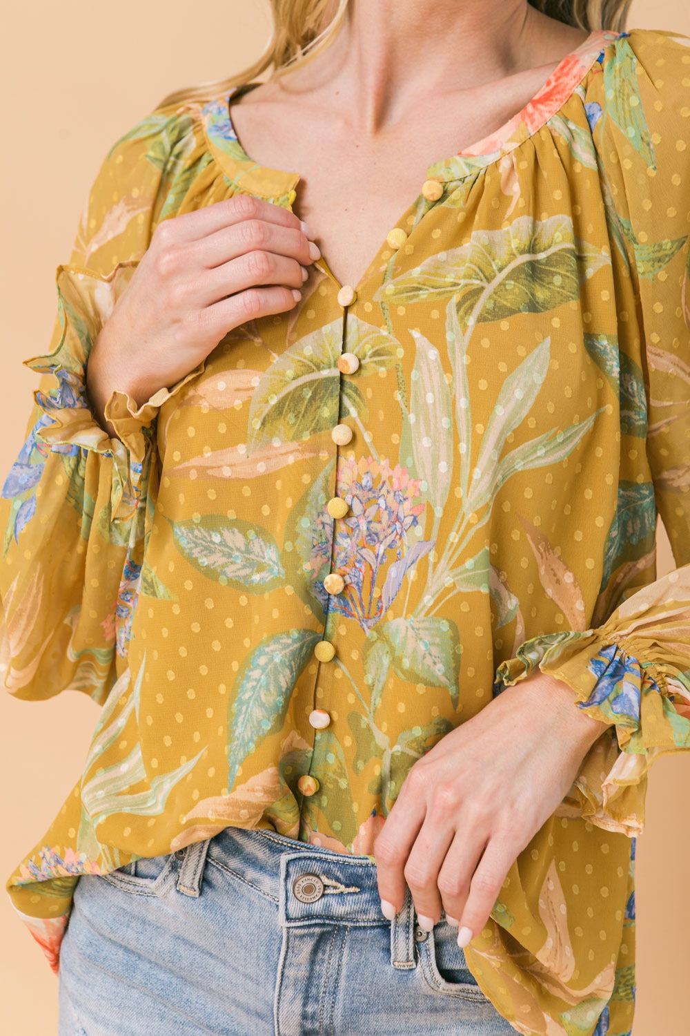 A printed woven top featuring round neckline, raglan sleeve with elasticized cuff with ruffle, button down and lined.